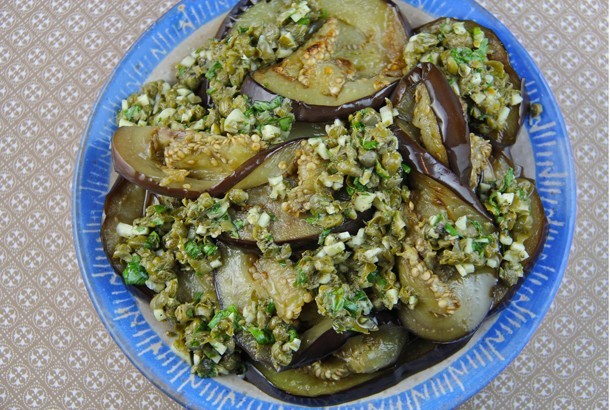 4. Once cooled, assemble the eggplant on a serving dish. Sprinkle with 1 tbsp. mixed herbs